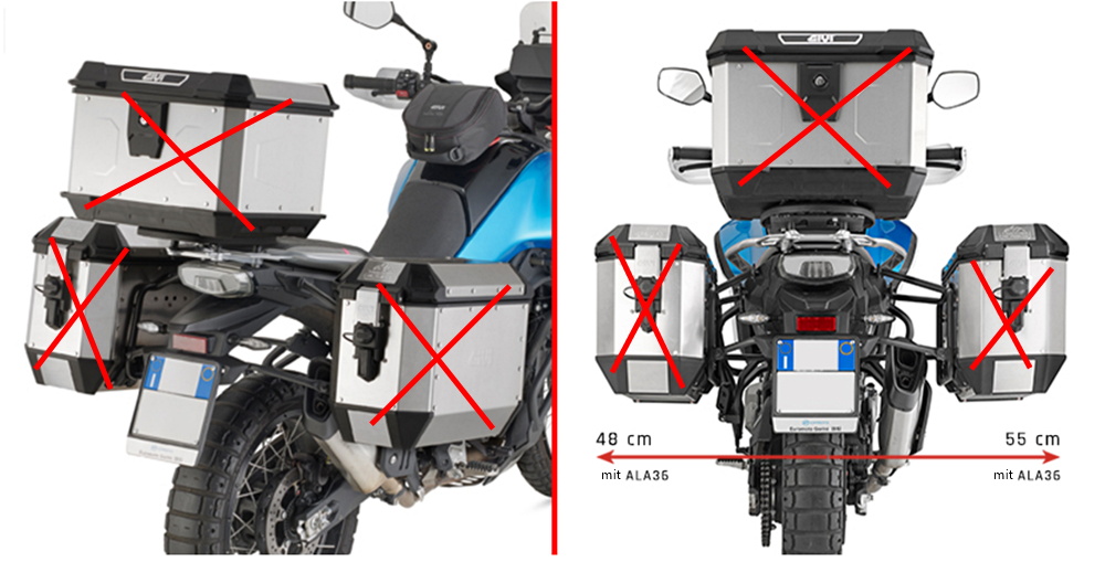 Givi Monokey Trekker Alaska 36 Liter Alu Seitenkoffer SatzDer Givi Monokey Trekker Alaska "Black Line" Seitenkoffer Set aus Aluminium, schwarz lackiert aus der Modellserie "Black Line".Der Trekker Alaska hat eine sehr stabile Konstruktion und ist ideal für Enduro und Offroad Motorräder.Sein Volumen beträgt jeweils 36 Liter und hat eine Zuladung von maximal 10 Kg pro Seitenkoffer.Passend mit einem Motorrad spezifischen GIVI Monokey Seitenkofferträger vom Typ PL___, PLR___ und PLOR___.Der Seitengepäckträger wird Motorrad spezifisch extra benötigt, ist nicht im Lieferumfang enthalten.Merkmale:Hergestellt aus robustem AluminiumNieten aus EdelstahlBlack Line - schwarz lackiertSecurity Schloßsatz mit Staubschutzinkl. zusätzlichen Schloß für TopcaseMax. Zuladung: je 10 kgje 36 Liter VolumenLieferumfang: 1x rechter und 1x linker SeitenkofferSeitenträger wird extra benötigt, ist nicht im Lieferumfang enthaltenAbmessung:Länge 562 mmBreite 260 mmHöhe 374 mmVolumen je 36 LiterErweiterbar mit Givi Zubehör:T506 Wasserdichte Innentasche 35 LiterE144 Elastisches GepäcknetzE145 Aufklebbare ReflektorenE162 Halterung für ThermoflascheSTF500S ThermoflascheE198 Koffer InnenlichtArtikelnummer:Givi ALA36BPACK2Passend für folgenden Modellen:Passend mit einem Motorrad spezifischen GIVI Monokey Seitenkofferträger vom Typ PL___, PLR___ und PLOR___.Der Seitengepäckträger wird Motorrad spezifisch extra benötigt, ist nicht im Lieferumfang enthalten.