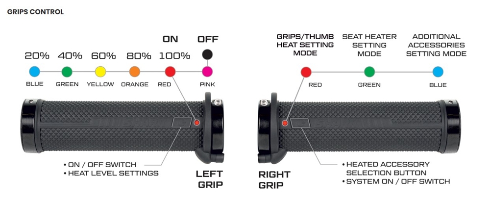 Der rechte Lenkergriff ist der Kontroller mit dem die 2 Heizzonen regelt werden kann. Der linke Lenkergriff regelt die Heizleistung für die Lenkergriffe und Daumengashebel zusammen und der Sitzheizung separat.